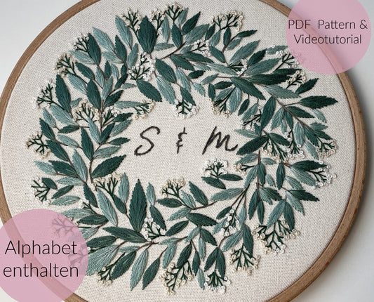 Stickvorlage, Greenery Kranz, Initialen, Blätterkranz, Ringkissen, Hochzeit, Monogramm, Sticken, Stickbild, Individuell, Geschenk