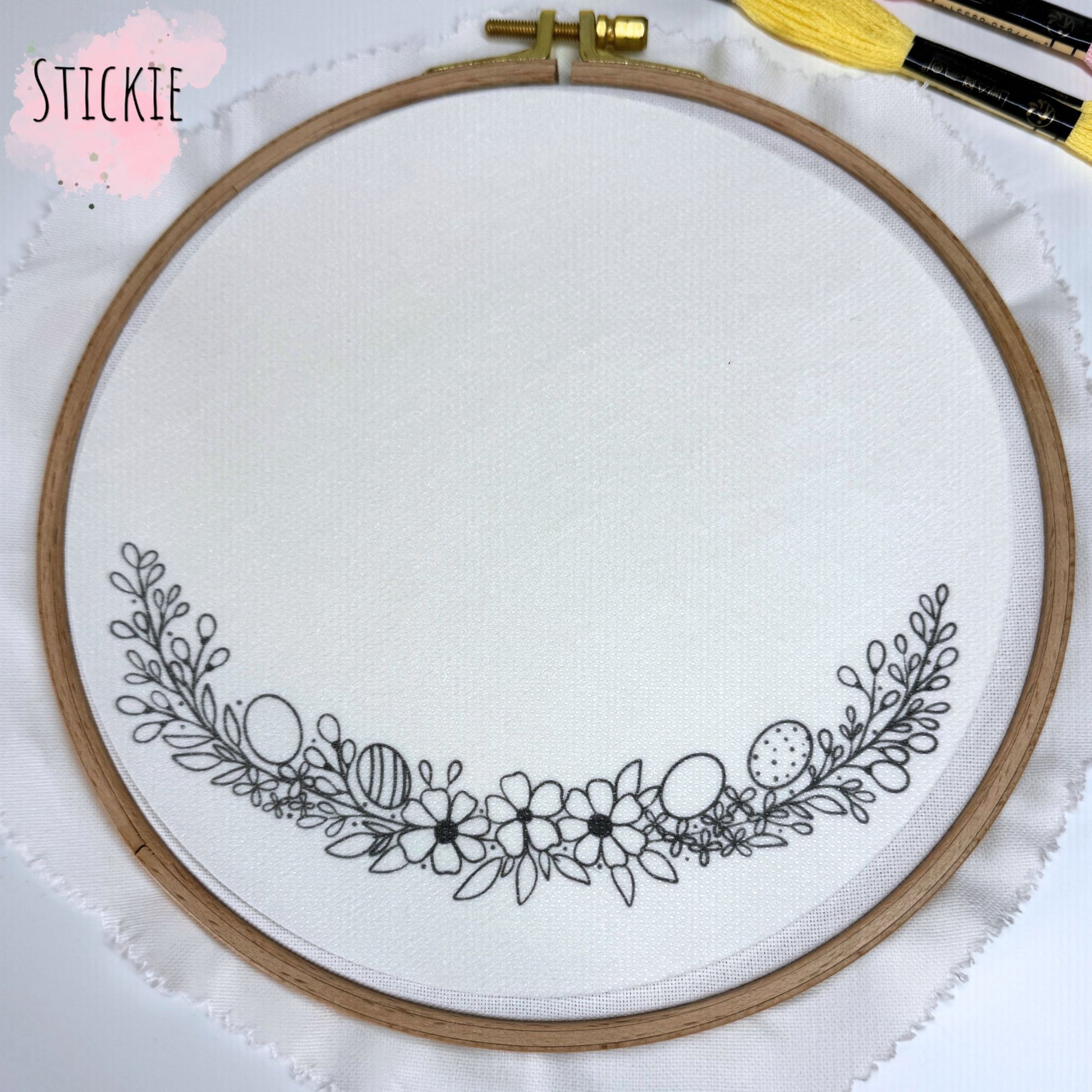 Diesen Stickie kannst du noch mit einem Schriftzug versehen und ihn so zu einem ganz persönlichen Osterprojekt machen. Die kleine Ranke ist recht filigran, aber lass dich davon bitte nicht abschrecken. Die Blumen müssen wirklich nicht super akkurat gestickt werden. Wenn sie ein bisschen locker und frei wirken, passt das sogar richtig gut zum Motiv.Die Ranke passt in einen 19 cm Stickring und eignet sich perfekt als Osterdeko oder als tolles Ostergeschenk.