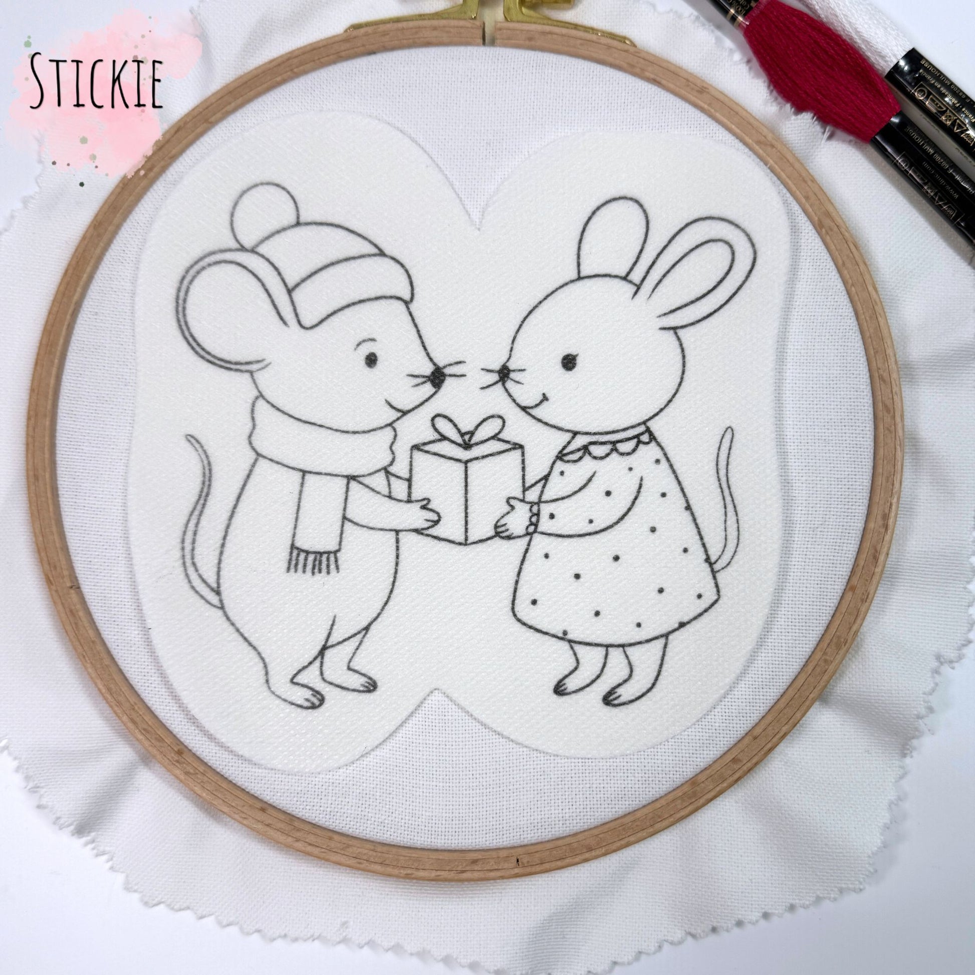 Diese beiden Mäuse sind nicht nur zuckersüß, sondern auch ein wunderbares Stickprojekt für die Weihnachtszeit. Das Motiv zeigt zwei kleine Mäuse, die sich liebevoll ein Geschenk überreichen, und bringt damit festliche Stimmung auf deinen Stoff. Du kannst die beiden Mäuse in einem 16 cm Stickrahmen sticken und ganz nach deinem Geschmack mit winterlichen Farben gestalten.